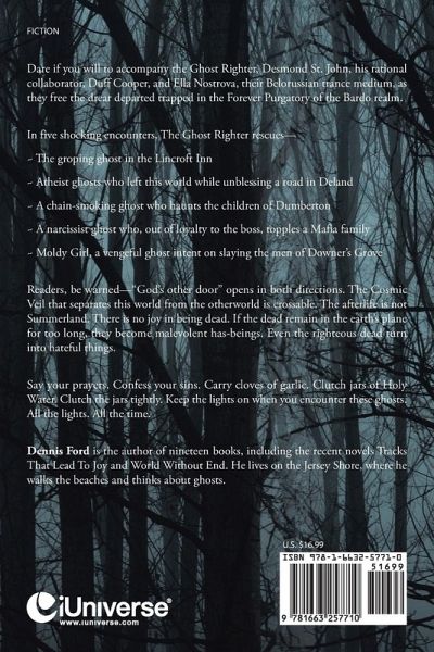 Dare if you will to accompany the Ghost Righter, Desmond St. John, his rational collaborator, Duff Cooper, and Ella Nostrova, their Belorussian trance medium, as they free the drear departed trapped in the Forever Purgatory of the Bardo realm. In five shocking encounters, The Ghost Righter rescues- ~ The groping ghost in the Lincroft Inn ~ Atheist ghosts who left this world while unblessing a road in Deland ~ A chain-smoking ghost who haunts the children of Dumberton ~ A narcissist ghost who, out of loyalty to the boss, topples a Mafia family ~ Moldy Girl, a vengeful ghost intent on slaying the men of Downer's Grove Readers, be warned-"God's other door" opens in both directions. The Cosmic Veil that separates this world from the otherworld is crossable. The afterlife is not Summerland. There is no joy in being dead. If the dead remain in the earth's plane for too long, they become malevolent has-beings. Even the righteous dead turn into hateful things. Say your prayers. Confess your sins. Carry cloves of garlic. Clutch jars of Holy Water. Clutch the jars tightly. Keep the lights on when you encounter these ghosts. All the lights. All the time.