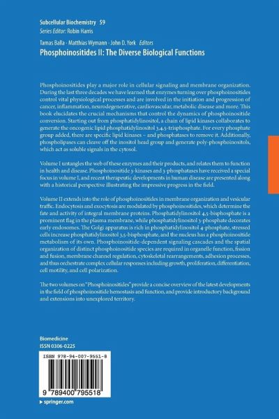 Phosphoinositides play a major role in cellular signaling and membrane organization. During the last three decades we have learned that enzymes turning over phosphoinositides control vital physiological processes and are involved in the initiation and progression of cancer, inflammation, neurodegenerative, cardiovascular, metabolic disease and more. In two volumes, this book elucidates the crucial mechanisms that control the dynamics of phosphoinositide conversion. Starting out from phosphatidylinositol, a chain of lipid kinases collaborates to generate the oncogenic lipid phosphatidylinositol(3,4,5)-trisphosphate. For every phosphate group added, there are specific lipid kinases - and phosphatases to remove it. Additionally, phospholipases can cleave off the inositol head group and generate poly-phosphoinositols, which act as soluble signals in the cytosol.Volume II extends into the role of phosphoinositides in membrane organization and vesicular traffic. Endocytosis and exocytosis are modulated by phosphoinositides, which determine the fate and activity of integral membrane proteins. Phosphatidylinositol(4,5)-bisphosphate is a prominent flag in the plasma membrane, while phosphatidylinositol-3-phosphate decorates early endosomes. The Golgi apparatus is rich in phosphatidylinositol-4-phosphate, stressed cells increase phosphatidylinositol(3,5)-bisphosphate, and the nucleus has a phosphoinositide metabolism of its own. Phosphoinositide-dependent signaling cascades and the spatial organization of distinct phosphoinositide species are required in organelle function, fission and fusion, membrane channel regulation, cytoskeletal rearrangements, adhesion processes, and thus orchestrate complex cellular responses including growth, proliferation, differentiation, cell motility, and cell polarization.
