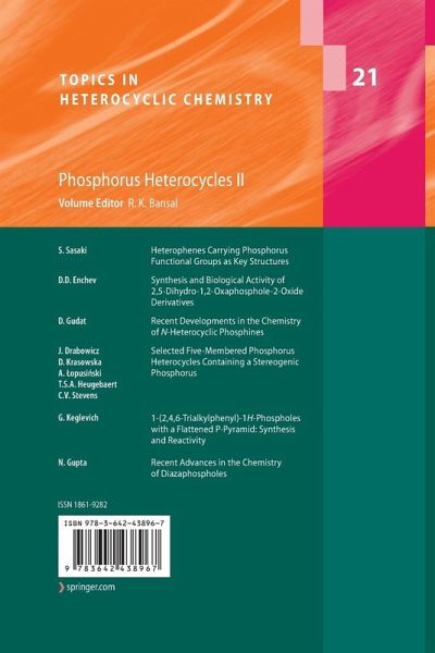 Contents:S. Sasaki: Heterophenes Carrying Phosphorus Functional Groups as Key Structures.- D.D. Enchev: Synthesis and Biological Activity of 2,5-Dihydro-1,2-Oxaphosphole-2-Oxide Derivatives.- D. Gudat: Recent Developments in the Chemistry of N -Heterocyclic Phosphines.- J. Drabowicz D. Krasowska A. Lopusinski T.S.A. Heugebaert C.V. Stevens: Selected Five-Membered Phosphorus Heterocycles Containing a Stereogenic Phosphorus.- G. Keglevich: 1-(2,4,6-Trialkylphenyl)-1 H -Phospholes with a Flattened P-Pyramid: Synthesis and Reactivity.- N. Gupta: Recent Advances in the Chemistry of Diazaphospholes