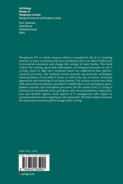 Soil organic phosphorus speciation by spectroscopic techniques.- Characterization of phosphorus forms in soil microorganisms.- The use of tracers to investigate phosphate cycling in soil/plant systems.- Molecular approaches to study biological phosphorus cycling.- Modelling phosphorus dynamics in the soil-plant system.- Role of mycorrhizal symbioses in phosphorus cycling.- Solubilization of phosphorus by soil microorganisms.- Role of soil macrofauna in phosphorus cycling.- Role of phosphatase enzymes in soil.- Rhizosphere processes, plant response and adaptations.- Biological phosphorus cycling in grasslands - Interactions with N.- Biological phosphorus cycling in arctic and alpine soils.- Phosphorus nutrition of forest plantations: the role of inorganic and organic phosphorus. Phosphorus cycling in tropical forests growing on highly weathered soils.- Biological P cycling in dryland regions.- Manure management effects on phosphorus biotransformations and losses in animal production.- Management impacts on biological phosphorus cycling in cropped soils.- Phosphorus and global change.