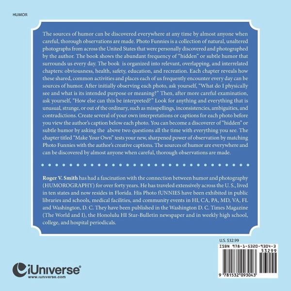The sources of humor can be discovered everywhere at any time by almost anyone when careful, thorough observations are made. Photo Funnies is a collection of natural, unaltered photographs from across the United States that were personally discovered and photographed by the author. The book shows the abundant frequency of "hidden" or subtle humor that surrounds us every day. The book is organized into relevant, overlapping, and interrelated chapters: obviousness, health, safety, education, and recreation. Each chapter reveals how these shared, common activities and places each of us frequently encounter every day can be sources of humor. After initially observing each photo, ask yourself, "What do I physically see and what is its intended purpose or meaning?" Then, after more careful examination, ask yourself, "How else can this be interpreted?" Look for anything and everything that is unusual, strange, or out of the ordinary, such as misspellings, inconsistencies, ambiguities, and contradictions. Create several of your own interpretations or captions for each photo before you view the author's caption below each photo. You can become a discoverer of "hidden" or subtle humor by asking the above two questions all the time with everything you see. The chapter titled "Make Your Own" tests your new, sharpened power of observation by matching Photo Funnies with the author's creative captions. The sources of humor are everywhere and can be discovered by almost anyone when careful, thorough observations are made.
