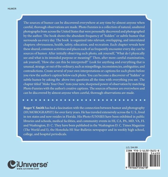 The sources of humor can be discovered everywhere at any time by almost anyone when careful, thorough observations are made. Photo Funnies is a collection of natural, unaltered photographs from across the United States that were personally discovered and photographed by the author. The book shows the abundant frequency of "hidden" or subtle humor that surrounds us every day. The book is organized into relevant, overlapping, and interrelated chapters: obviousness, health, safety, education, and recreation. Each chapter reveals how these shared, common activities and places each of us frequently encounter every day can be sources of humor. After initially observing each photo, ask yourself, "What do I physically see and what is its intended purpose or meaning?" Then, after more careful examination, ask yourself, "How else can this be interpreted?" Look for anything and everything that is unusual, strange, or out of the ordinary, such as misspellings, inconsistencies, ambiguities, and contradictions. Create several of your own interpretations or captions for each photo before you view the author's caption below each photo. You can become a discoverer of "hidden" or subtle humor by asking the above two questions all the time with everything you see. The chapter titled "Make Your Own" tests your new, sharpened power of observation by matching Photo Funnies with the author's creative captions. The sources of humor are everywhere and can be discovered by almost anyone when careful, thorough observations are made.