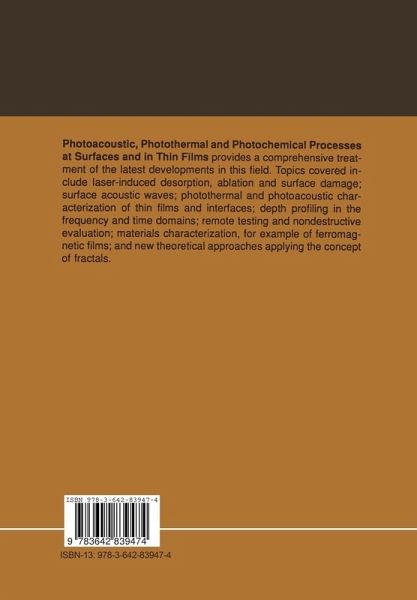 Photoacoustic, Photothermal and Photochemical Processes at Surfaces and in Thin Films provides a comprehensive treatment of the latest developments in this field. Topics covered include laser-induced desorption, ablation and surface damage; surface acoustic waves; photothermal and photoacoustic characterization of thin films and interfaces; depth profiling in the frequency and time domains; remote testing and nondestructive evaluation; materials characterization, for example of ferromagnetic films; and new theoretical approaches applying the concept of fractals.