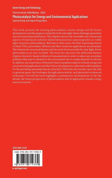 This book presents the existing photocatalytic reactor design and the future developments and the progress needed for both solar light-driven hydrogen generation and environmental purification. The chapters discuss the renewable and commercial aspects of translucent polymer-linked heterojunction nanocomposites as visible light-responsive photocatalysts. Relevant to these areas, the field of growing interest in black-TiO2, perovskites, MXenes and their numerous applications are presented. The framework, structural features and the need of mesocrystals for solar light-driven photocatalysis are also included. The book also discusses the additional features of green chemistry-based synthesis of nanomaterials in order to reduce any secondary pollution that may be released in the environment due to unsafe disposal of solvents. In addition, the importance of bismuth-based nanophotocatalysts towards energy and environmental applications and their future development as alternative photocatalysts for the prevailing nanomaterials are presented. The book also touches upon the idea to generate green fuel hydrogen through photocatalytic and photoelectrochemical techniques. Overall the book highlights contemporary developments in the last decade, the future perspectives of photocatalysis and its application towards energy and environment.