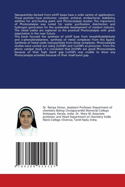 Nanoparticles derived from schiff bases have a wide variety of applications. These particles have antitumor, catalyst, antiviral, antibacterial, stabilizing additive for anti-fouling paint and Photocatalysis studies. The importance of Photocatalysis was noted for water purification disinfection and hydrogen generation for the sustainable development of modern industry. The metal oxides are explored as the practical Photocatalysis with great expectation in the near future. This book focused the synthesis of schiff base from terephthalaldehyde and o-phenylenediamine, synthesis of metal complexes from this ligand. Synthesis of metal oxide nanoparticles from these complexes. Photocatalysis studies were carried out using ZnONPs and CuONPs as precursor. From the photo catalyst study it is concluded that ZnONPs are good Photocatalysis because of their high band gap. CuONPs was unable to show any Photocatalysis activities because of their small band gap.