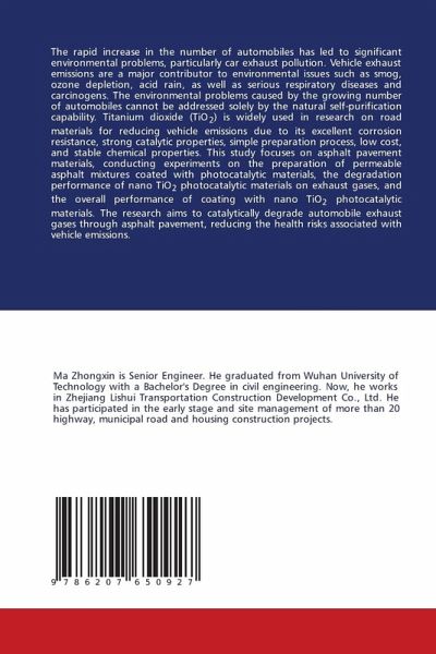 The rapid increase in the number of automobiles has led to significant environmental problems, particularly car exhaust pollution. Vehicle exhaust emissions are a major contributor to environmental issues such as smog, ozone depletion, acid rain, as well as serious respiratory diseases and carcinogens. The environmental problems caused by the growing number of automobiles cannot be addressed solely by the natural self-purification capability. Titanium dioxide (TiO2) is widely used in research on road materials for reducing vehicle emissions due to its excellent corrosion resistance, strong catalytic properties, simple preparation process, low cost, and stable chemical properties. This study focuses on asphalt pavement materials, conducting experiments on the preparation of permeable asphalt mixtures coated with photocatalytic materials, the degradation performance of nano TiO2 photocatalytic materials on exhaust gases, and the overall performance of coating with nano TiO2 photocatalytic materials. The research aims to catalytically degrade automobile exhaust gases through asphalt pavement, reducing the health risks associated with vehicle emissions.
