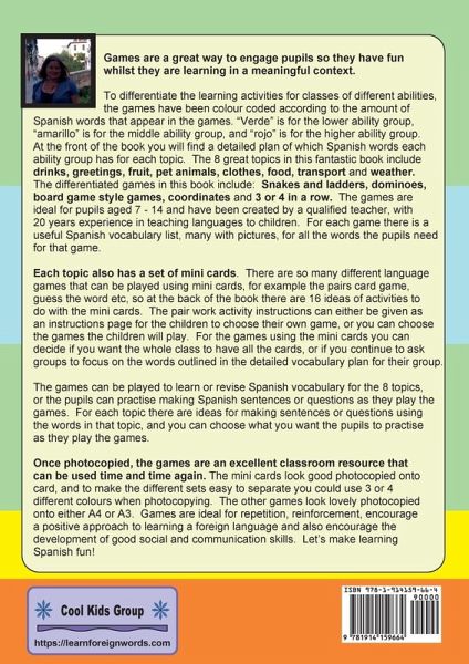 Games are a great way to engage pupils so they have fun whilst they are learning in a meaningful context. To differentiate the learning activities for classes of different abilities, the games have been colour coded according to the amount of Spanish words that appear in the games. "Verde" is for the lower ability group, "amarillo" is for the middle ability group, and "rojo" is for the higher ability group. At the front of the book you will find a detailed plan of which Spanish words each ability group has for each topic. The 8 great topics in this fantastic book include drinks, greetings, fruit, pet animals, clothes, food, transport and weather. The differentiated games in this book include: Snakes and ladders, dominoes, board game style games, coordinates and 3 or 4 in a row. The games are ideal for pupils aged 7 - 14 and have been created by a qualified teacher, with 20 years experience in teaching languages to children. For each game there is a useful Spanish vocabulary list, many with pictures, for all the words the pupils need for that game. Each topic also has a set of mini cards. There are so many different language games that can be played using mini cards, for example the pairs card game, guess the word etc, so at the back of the book there are 16 ideas of activities to do with the mini cards. The pair work activity instructions can either be given as an instructions page for the children to choose their own game, or you can choose the games the children will play. For the games using the mini cards you can decide if you want the whole class to have all the cards, or if you continue to ask groups to focus on the words outlined in the detailed vocabulary plan for their group. The games can be played to learn or revise Spanish vocabulary for the 8 topics, or the pupils can practise making Spanish sentences or questions as they play the games. For each topic there are ideas for making sentences or questions using the words in that topic, and you can choose what you want the pupils to practise as they play the games. Once photocopied, the games are an excellent classroom resource that can be used time and time again. The mini cards look good photocopied onto card, and to make the different sets easy to separate you could use 3 or 4 different colours when photocopying. The other games look lovely photocopied onto either A4 or A3. Games are ideal for repetition, reinforcement, encourage a positive approach to learning a foreign language and also encourage the development of good social and communication skills. Let's make learning Spanish fun!