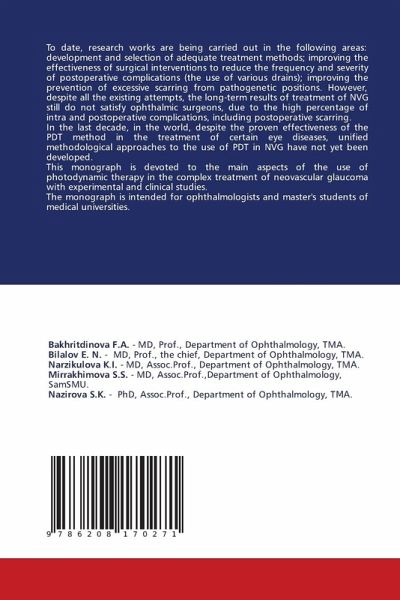 To date, research works are being carried out in the following areas: development and selection of adequate treatment methods; improving the effectiveness of surgical interventions to reduce the frequency and severity of postoperative complications (the use of various drains); improving the prevention of excessive scarring from pathogenetic positions. However, despite all the existing attempts, the long-term results of treatment of NVG still do not satisfy ophthalmic surgeons, due to the high percentage of intra and postoperative complications, including postoperative scarring.In the last decade, in the world, despite the proven effectiveness of the PDT method in the treatment of certain eye diseases, unified methodological approaches to the use of PDT in NVG have not yet been developed. This monograph is devoted to the main aspects of the use of photodynamic therapy in the complex treatment of neovascular glaucoma with experimental and clinical studies.The monograph is intended for ophthalmologists and master's students of medical universities.