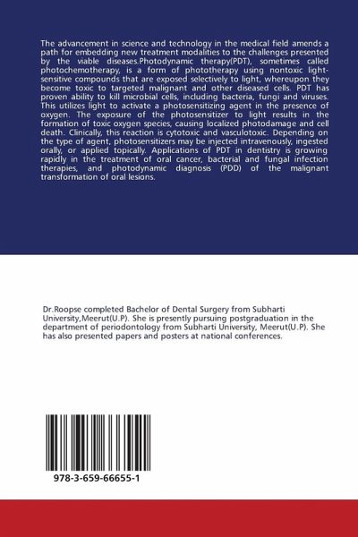 The advancement in science and technology in the medical field amends a path for embedding new treatment modalities to the challenges presented by the viable diseases.Photodynamic therapy(PDT), sometimes called photochemotherapy, is a form of phototherapy using nontoxic light-sensitive compounds that are exposed selectively to light, whereupon they become toxic to targeted malignant and other diseased cells. PDT has proven ability to kill microbial cells, including bacteria, fungi and viruses. This utilizes light to activate a photosensitizing agent in the presence of oxygen. The exposure of the photosensitizer to light results in the formation of toxic oxygen species, causing localized photodamage and cell death. Clinically, this reaction is cytotoxic and vasculotoxic. Depending on the type of agent, photosensitizers may be injected intravenously, ingested orally, or applied topically. Applications of PDT in dentistry is growing rapidly in the treatment of oral cancer, bacterialand fungal infection therapies, and photodynamic diagnosis (PDD) of the malignant transformation of oral lesions.