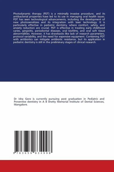 Photodynamic therapy (PDT) is a minimally invasive procedure, and its antibacterial properties have led to its use in managing oral health issues. PDT has seen technological advancements, including the development of new photosensitizes and its integration with laser technology. It is particularly effective in pediatric dentistry, where comfort, safety, and anxiety reduction are crucial. PDT is effective in treating early childhood caries, gingivitis, periodontal diseases, oral biofilms, and oral soft tissue abnormalities. However, it has drawbacks like lack of research parameters, protocol variability, and the need for expensive equipment. Combining PDT with antibiotics can mitigate antibiotic resistance, but its application in pediatric dentistry is still in the preliminary stages of clinical research.