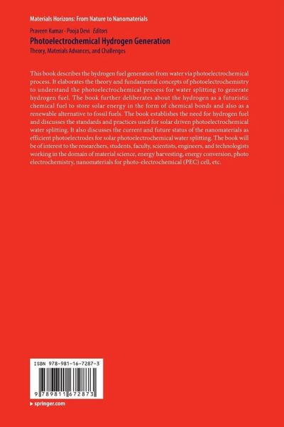 This book describes the hydrogen fuel generation from water via photoelectrochemical process. It elaborates the theory and fundamental concepts of photoelectrochemistry to understand the photoelectrochemical process for water splitting to generate hydrogen fuel. The book further deliberates about the hydrogen as a futuristic chemical fuel to store solar energy in the form of chemical bonds and also as a renewable alternative to fossil fuels. The book establishes the need for hydrogen fuel and discusses the standards and practices used for solar driven photoelectrochemical water splitting. It also discusses the current and future status of the nanomaterials as efficient photoelectrodes for solar photoelectrochemical water splitting. The book will be of interest to the researchers, students, faculty, scientists, engineers, and technologists working in the domain of material science, energy harvesting, energy conversion, photo electrochemistry, nanomaterials for photo-electrochemical (PEC) cell, etc.