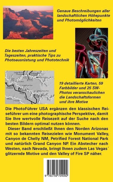 Die PhotoFührer USA ergänzen den klassischen Reiseführer um eine photographische Perspektive, damit Sie Ihre wertvolle Reisezeit auf der Suche nach den besten Bildern optimal nutzen können. Dieser Band erschließt Ihnen den Norden Arizonas mit so bekannten Reisezielen wie Monument Valley, Canyon de Chelly, Petrified Forest und natürlich den Grand Canyon. Ein Abstecher nach Westen, nach Nevada, bringt Ihnen zudem Las Vegas¿ glitzernde Motive und das Valley of Fire näher. Im Buch finden Sie genaue Beschreibungen aller landschaftlichen Höhepunkte und Photomöglichkeiten, die besten Jahreszeiten und Tageszeiten sowie praktische Tipps zu Photoausrüstung und Phototechnik. 19 detaillierte Karten, 59 Farbbilder und 25 SW-Photos veranschaulichen Ihnen auf 96 Seiten Landschaft und Motive. Ein Anhang mit Klimadaten, Angaben zu Sonnenauf- und -untergangszeiten sowie Daten von Vollmondtagen ergänzen das Angebot.