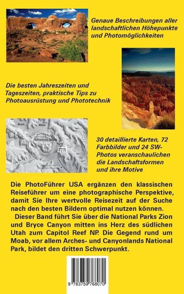 Die PhotoFührer USA ergänzen den klassischen Reiseführer um eine photographische Perspektive, damit Sie Ihre wertvolle Reisezeit auf der Suche nach den besten Bildern optimal nutzen können. Der Band "Südutah" führt Sie über die National Parks Zion und Bryce Canyon mitten ins Herz des südlichen Utah zum Capitol Reef NP. Die Gegend rund um Moab, vor allem Arches- und Canyonlands National Park, bildet den dritten Schwerpunkt. Im Buch finden Sie genaue Beschreibungen aller landschaftlichen Höhepunkte und Photomöglichkeiten, die besten Jahreszeiten und Tageszeiten sowie praktische Tipps zu Photoausrüstung und Phototechnik. 30 detaillierte Karten, 72 Farbbilder und 24 SW-Photos veranschaulichen Ihnen auf 128 Seiten Landschaft und Motive. Ein Anhang mit Klimadaten, Angaben zu Sonnenauf- und -untergangszeiten sowie Daten von Vollmondtagen ergänzen das Angebot.