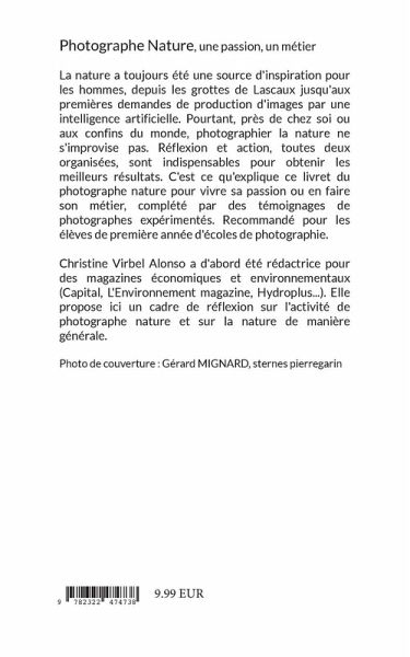 La nature a toujours été une source d'inspiration pour les hommes, depuis les grottes de Lascaux jusqu'aux premières demandes de production d'images par une intelligence artificielle. Pourtant, photographier la nature ne s'improvise pas. Réflexion et action, toutes deux organisées, sont indispensables pour obtenir les meilleurs résultats. C'est ce qu'explique ce livret du photographe nature pour vivre sa passion ou en faire son métier, complété par des témoignages de photographes expérimentés. Recommandé pour les élèves de première année d'écoles de photographie.