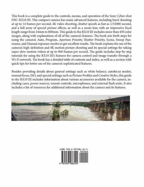 This book is a complete guide to using the Sony Cyber-shot DSC-RX10 III camera. With this book, author Alexander White provides users of the RX10 III with a manual covering all aspects of the camera's operation. Using a tutorial-like approach, the book shows beginning and intermediate photographers how to accomplish things with the RX10 III, and explains when and why to use the camera's many features. The book provides details about the camera's shooting modes as well as its menu options for shooting, playback, setup, and special effects. The book covers all features of the RX10 III that are new for this model, including its high-quality zoom lens with a reach of 600mm; its Zoom Assist feature, which lets a photographer instantly pull back the zoom lens for a wide view before zooming back to a telephoto shot; and its additional controls, including a Focus Hold button on the side of the lens and a third Custom button, which is available for programming by the user. The book includes more than 450 color photographs that illustrate the camera's controls, display screens, and menus. The images include examples of photographs taken using the RX10 III's Scene mode, with settings optimized for subjects such as landscapes, sunsets, portraits, and action shots; and its Creative Style and Picture Effect menu options, with settings for altering the appearance of images. The book also provides introductions to topics such as street photography and infrared photography, and includes details on using the camera's Wi-Fi features for transferring images to a smartphone or tablet, or controlling the camera from such a device. The book includes a full discussion of the video features of the RX10 III, which can shoot HD and 4K (ultra-HD) movies, with manual control of exposure and focus during movie recording. The book explains the camera's numerous features for professional-level videography, including Picture Profiles that allow adjustment of settings such as gamma curve, black level, knee, and detail. The book describes the steps for recording 4K video to an external video recorder using the "clean" video output from the camera's HDMI port. In three appendices, the book discusses accessories for the RX10 III, including cases, power sources, remote controls, microphones and external flash units, and includes a list of websites and other resources for further information. The book includes an appendix with "quick tips" on how to take advantage of the camera's features in the most efficient ways possible. This guide to the RX10 III includes a detailed index, so the reader can quickly find needed information about any particular feature or aspect of the camera.
