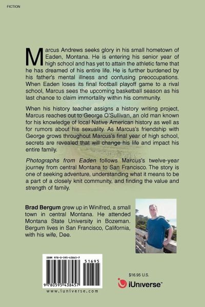 Marcus Andrews seeks glory in his small hometown of Eaden, Montana. He is entering his senior year of high school and has yet to attain the athletic fame that he has dreamed of his entire life. He is further burdened by his father's mental illness and confusing preoccupations. When Eaden loses its final football playoff game to a rival school, Marcus sees the upcoming basketball season as his last chance to claim immortality within his community. When his history teacher assigns a history writing project, Marcus reaches out to George O'Sullivan, an old man known for his knowledge of local Native American history as well as for rumors about his sexuality. As Marcus's friendship with George grows throughout Marcus's final year of high school, secrets are revealed that will change his life and impact his entire family. Photographs from Eaden follows Marcus's twelve-year journey from central Montana to San Francisco. The story is one of seeking adventure, understanding what it means to be a part of a closely knit community, and finding the value and strength of family.