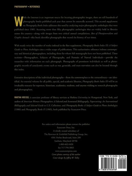 While the Internet is an important source for locating photographic images, there still are hundreds of photography books published each year for whose contents there is no external access. This second supplement to Photography Books Index addresses this need by analyzing important photographic anthologies that have been published since 1985. Accessing more than fifty photographic anthologies that are widely held in libraries across the country-along with images from two critical annual compilations, Best of Photojournalism and Graphis Annual-this book identifies photographs that record the history of our times. This reference guide provides an important index to contemporary as well as historical photographers, including those for whom full monographs have not been published. Photographs of important individuals as well as photographic records of cataclysmic events can be located through this index. Extensive descriptions of the individual photographs-from the commonplace to the extraordinary-are identified in this volume. Organized into three sections-Photographers, Subjects of Photographs, and Portraits of Named Individuals-these descriptions provide the researcher with important information on each photograph. An essential volume for all public, special and academic libraries, this index will be an invaluable resource for reporters, historians, academics, students and anyone wishing to research photographs and photographers.