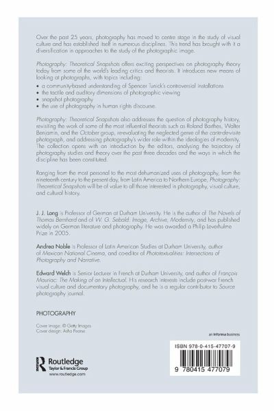 Photography: Theoretical Snapshots offers exciting perspectives on photography theory today from some of the world's leading critics and theorists. It introduces new means of looking at photographs, and addresses the question of photography history, revisiting the work of some of the most influential theorists such as Roland Barthes, Walter Benjamin, and the October group.