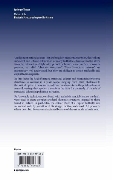 Unlike most natural colours that are based on pigment absorption, the striking iridescent and intense colouration of many butterflies, birds or beetles stems from the interaction of light with periodic sub-micrometer surface or volume patterns, so called "photonic structures". These "structural colours" are increasingly well understood, but they are difficult to create artificially and exploit technologically.In this thesis the field of natural structural colours and biomimetic photonic structures is covered in a wide scope, ranging from plant photonics to theoretical optics. It demonstrates diffractive elements on the petal surfaces of many flowering plant species; these form the basis for the study of the role of structural colours in pollinator attraction.Self-assembly techniques, combined with scale able nanofabrication methods, were used to create complex artificial photonic structures inspired by those found in nature. In particular, the colour effect of a Papilio butterflywas mimicked and, by variation of its design motive, enhanced. All photonic effects described here are underpinned by state-of-the-art model calculations.