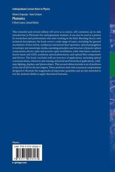 This extended and revised edition will serve as a concise, self-contained, up-to-date introduction to Photonics for undergraduate students. It can also be used as a primer by researchers and professionals who start working in the field. Blending theory with technical descriptions, the book covers a wide range of topics, including the general mechanism of laser action, continuous and pulsed laser operation, optical propagation in isotropic and anisotropic media, operating principles and structure of passive optical components, electro-optic and acousto-optic modulation, solid-state lasers, semiconductor lasers and LEDs, nonlinear optical phenomena, and optical fiber components and devices. The book concludes with an overview of applications, including optical communications, telemetry and sensing, industrial and biomedical applications, solid-state lighting, displays, and photovoltaics. This second edition includes a set of problems at the end of all but the lastchapter. These problems deal with numerical computations designed to illustrate the magnitudes of important quantities and are also intended to test the student's ability to apply theoretical formulas.