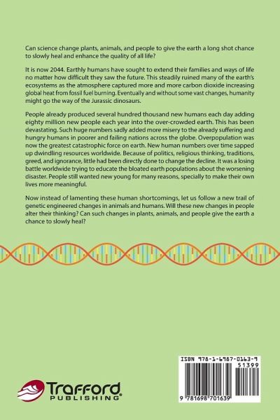 Changing how humans on the earth might become less overpopulating and more in balance with their environment is the thrust of this story. Survival of people requires a change in human thinking and living patterns that have endangered the earths resources as climate change stressed and altered the human future. Since human over reproduction resulted in huge energy demands as well as food production declines, what can change this tailspin of humans living out of balance with the carrying capacity of the earth? All of humanity seems in danger as people want more of everything, much more than the earth can furnish in food, living space and energy. As the earth heats up year by year with higher temperatures, what can stop the harmful ideas cemented in human thinking? Will genetic engineers save humanity?
