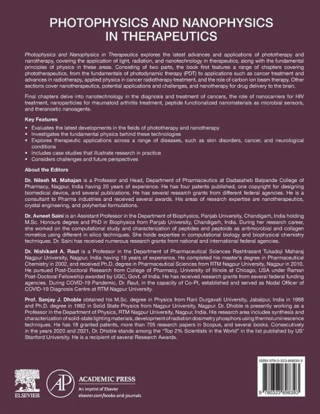 Photophysics and Nanophysics in Therapeutics explores the latest advances and applications of phototherapy and nanotherapy, covering the application of light, radiation, and nanotechnology in therapeutics, along with the fundamental principles of physics in these areas. Consisting of two parts, the book first features a range of chapters covering phototherapeutics, from the fundamentals of photodynamic therapy (PDT) to applications such as cancer treatment and advances in radiotherapy, applied physics in cancer radiotherapy treatment, and the role of carbon ion beam therapy. Other sections cover nanotherapeutics, potential applications and challenges, and nanotherapy for drug delivery to the brain. Final chapters delve into nanotechnology in the diagnosis and treatment of cancers, the role of nanocarriers for HIV treatment, nanoparticles for rheumatoid arthritis treatment, peptide functionalized nanomaterials as microbial sensors, and theranostic nanoagents.