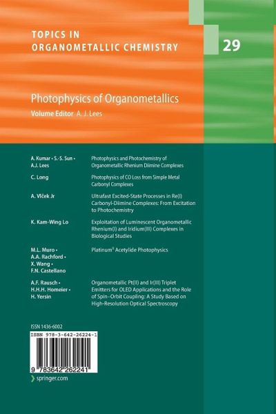 Arvind Kumar, Shih-Sheng Sun, and Alistair J. Lees: Photophysics and Photochemistry of Organometallic Rhenium Diimine Complexes; Conor Long: Photophysics of CO Loss from Simple Metal Carbonyl Complexes; Antonín Vlcek Jr: Ultrafast Excited-State Processes in Re(I) Carbonyl-Diimine Complexes: From Excitation to Photochemistry; Kenneth Kam-Wing Lo: Exploitation of Luminescent Organometallic Rhenium(I) and Iridium(III) Complexes in Biological Studies; Maria L. Muro , Aaron A. Rachford , Xianghuai Wang, and Felix N. Castellano: Platinum II Acetylide Photophysics; Andreas F. Rausch, Herbert H. H. Homeier, and Hartmut Yersin: Organometallic Pt(II) and Ir(III) Triplet Emitters for OLED Applications and the Role of Spin-Orbit Coupling: A Study Based on High-Resolution Optical Spectroscopy.