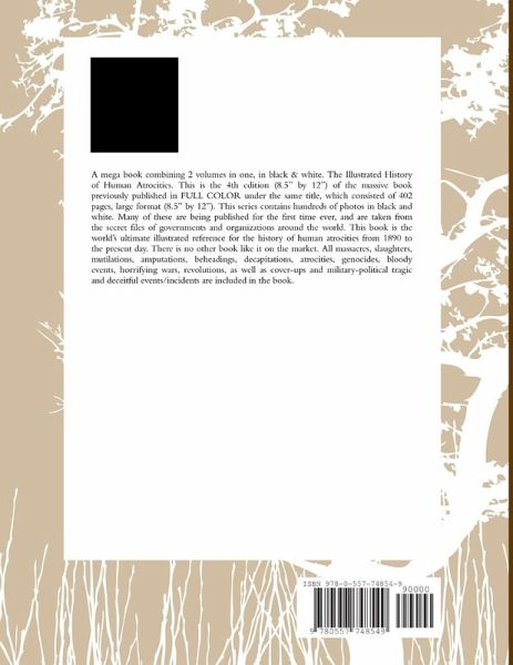 A mega book combining 2 volumes in one, in black & white. The Illustrated History of Human Atrocities. This is the 4th edition (8.5" by 12") of the massive book previously published in FULL COLOR under the same title, which consisted of 402 pages, large format (8.5" by 12"). This series contains hundreds of photos in black and white. Many of these are being published for the first time ever, and are taken from the secret files of governments and organizations around the world. This book is the world's ultimate illustrated reference for the history of human atrocities from 1890 to the present day. There is no other book like it on the market. All massacres, slaughters, mutilations, amputations, beheadings, decapitations, atrocities, genocides, bloody events, horrifying wars, revolutions, as well as cover-ups and military-political tragic and deceitful events/incidents are included in the book.