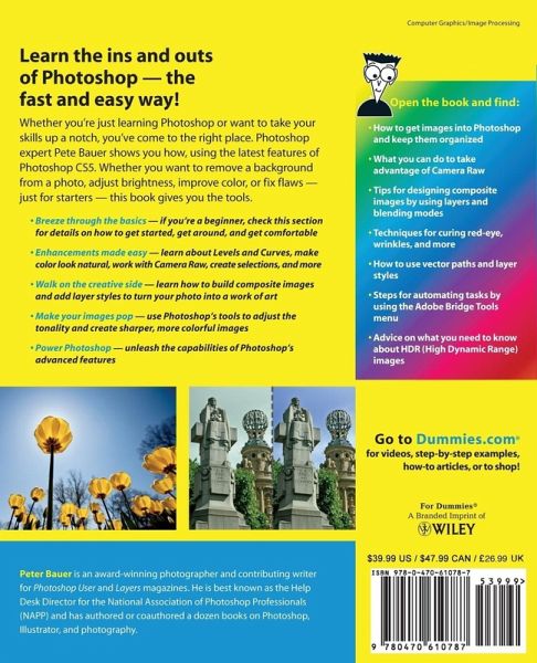 Learn the ins and outs of Photoshop -- the fast and easy way! Whether you're just learning Photoshop or want to take your skills up a notch, you've come to the right place. Photoshop expert Pete Bauer shows you how, using the latest features of Photoshop CS5. Whether you want to remove a background from a photo, adjust brightness, improve color, or fix flaws -- just for starters -- this book gives you the tools. * Breeze through the basics -- if you're a beginner, check this section for details on how to get started, get around, and get comfortable * Enhancements made easy -- learn about Levels and Curves, make color look natural, work with Camera Raw, create selections, and more * Walk on the creative side -- learn how to build composite images and add layer styles to turn your photo into a work of art * Make your images pop -- use Photoshop's tools to adjust the tonality and create sharper, more colorful images * Power Photoshop -- unleash the capabilities of Photoshop's advanced features Open the book and find: * How to get images into Photoshop and keep them organized * What you can do to take advantage of Camera Raw * Tips for designing composite images by using layers and blending modes * Techniques for curing red-eye, wrinkles, and more * How to use vector paths and layer styles * Steps for automating tasks by using the Adobe Bridge Tools menu * Advice on what you need to know about HDR (High Dynamic Range) images