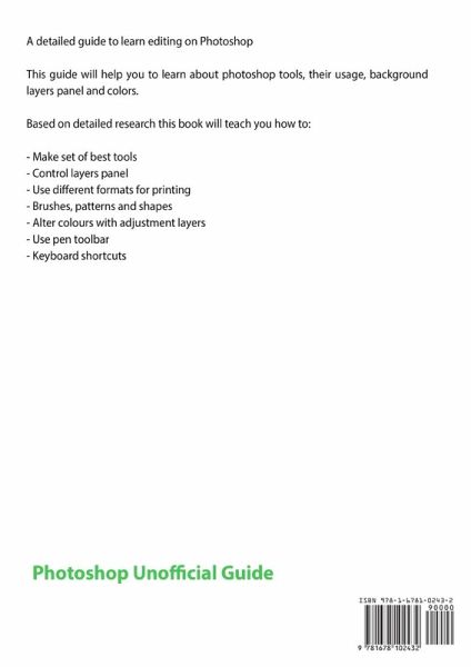 A detailed guide to learn editing on Photoshop This guide will help you to learn about photoshop tools, their usage, background layers panel and colors. Based on detailed research this book will teach you how to: - Make set of best tools - Control layers panel - Use different formats for printing - Brushes, patterns and shapes - Alter colours with adjustment layers - Use pen toolbar - Keyboard shortcuts If you want to learn the basics of photoshop editing, then this book is for you. --> Scroll to the top of the page and click add to cart to purchase instantly <-- Disclaimer: This author and or rights owner(s) make no claims, promises, or guarantees about the accuracy, completeness, or adequacy of the contents of this book, and expressly disclaims liability for errors and omissions in the contents within. This product is for reference use only.