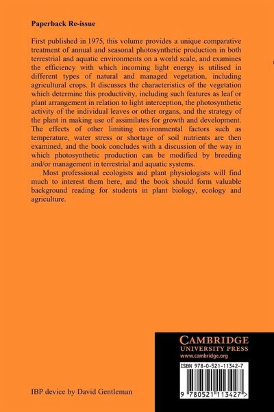 First published in 1975, this volume provides a unique comparative treatment of annual and seasonal photosynthetic production in both terrestrial and aquatic environments on a world scale and examines the efficiency with which incoming light energy is utilised in different types of natural and managed vegetation, including agricultural crops. It discusses the characteristics of the vegetation which determine this productivity, including such features as leaf or plant arrangement in relation to light interception, the photosynthetic activity of the individual leaves or other organs and the strategy of the plant in making use of assimilates for growth and development. Most professional ecologists and plant physiologists will find much to interest them here and the book should form valuable background reading for students in plant biology, ecology and agriculture.
