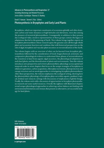 Bryophytes, which are important constituents of ecosystems globally and often dominate carbon and water dynamics at high latitudes and elevations, were also among the pioneers of terrestrial photosynthesis. Consequently, in addition to their present day ecological value, modern representatives of these groups contain the legacy of adaptations that led to the greening of Earth. This volume brings together experts on bryophyte photosynthesis whose research spans the genome and cell through whole plant and ecosystem function and combines that with historical perspectives on the role of algal, bryophyte and vascular plant ancestors on terrestrialization of the Earth. The eighteen well-illustrated chapters reveal unique physiological approaches to achieving carbon balance and dealing with environmental limitations and stresses that present an alternative, yet successful strategy for land plants.