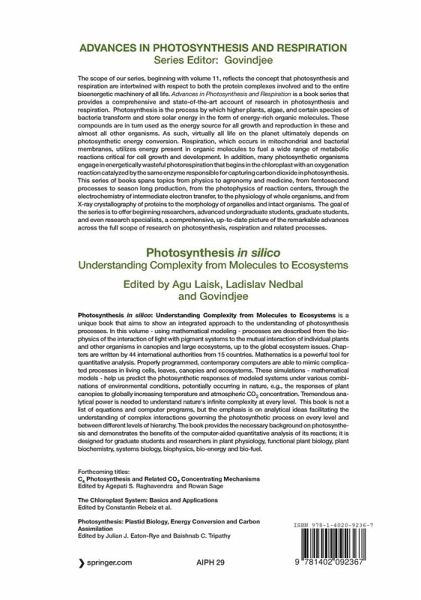 Photosynthesis in silico: Understanding Complexity from Molecules to Ecosystems is a unique book that aims to show an integrated approach to the understanding of photosynthesis processes. In this volume - using mathematical modeling - processes are described from the biophysics of the interaction of light with pigment systems to the mutual interaction of individual plants and other organisms in canopies and large ecosystems, up to the global ecosystem issues. Chapters are written by 44 international authorities from 15 countries. Mathematics is a powerful tool for quantitative analysis. Properly programmed, contemporary computers are able to mimic complicated processes in living cells, leaves, canopies and ecosystems. These simulations - mathematical models - help us predict the photosynthetic responses of modeled systems under various combinations of environmental conditions, potentially occurring in nature, e.g., the responses of plant canopies to globally increasing temperature and atmospheric CO2 concentration. Tremendous analytical power is needed to understand nature's infinite complexity at every level.