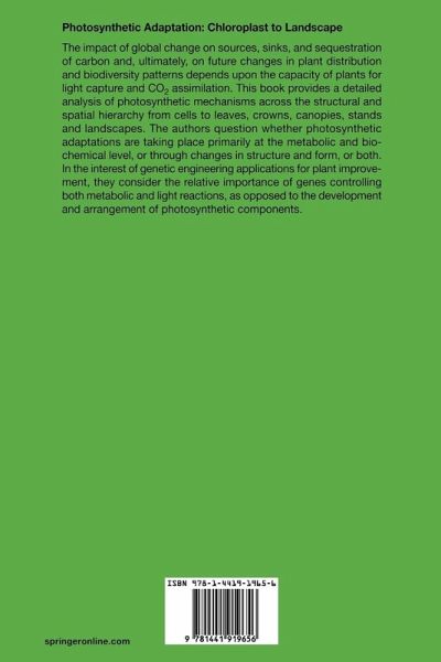 Photosynthetic Adaptation: Chloroplast to Landscape thoroughly studies photosynthetic mechanisms at each structural level, from cells to leaves, crown, and canopy. The authors question whether photosynthetic adaptations take place primarily at the metabolic and biochemical level or through changes in structure and form, or both. In the interest of genetic engineering and agricultural applications, the authors analyze the relative importance of genes that control both metabolic and light reactions as well as the structure, arrangement, and orientation of photosynthesis.