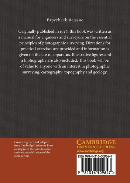 Originally published in 1926, this book was written as a manual for engineers and surveyors on the essential principles of photographic surveying. Directions for practical exercises are provided and information is given on the use of apparatus. Illustrative figures and a bibliography are also included. This book will be of value to anyone with an interest in photographic surveying, cartography, topography and geology.