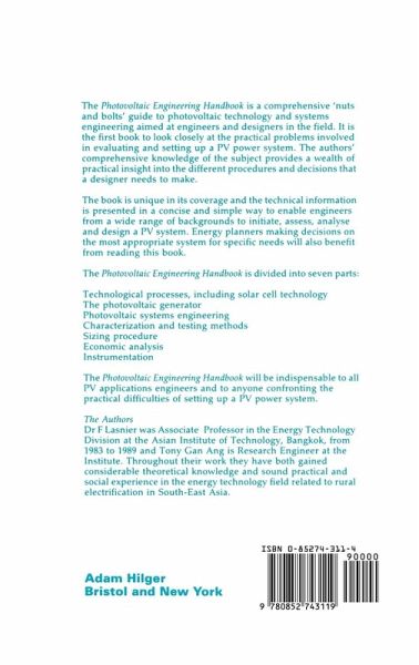 The Photovoltaic Engineering Handbook is the first book to look closely at the practical problems involved in evaluating and setting up a photovoltaic (PV) power system. The author's comprehensive knowledge of the subject provides a wealth of theoretical and practical insight into the different procedures and decisions that designers need to make. Unique in its coverage, the book presents technical information in a concise and simple way to enable engineers from a wide range of backgrounds to initiate, assess, analyze, and design a PV system. It is beneficial for energy planners making decisions on the most appropriate system for specific needs, PV applications engineers, and anyone confronting the practical difficulties of setting up a PV power system.