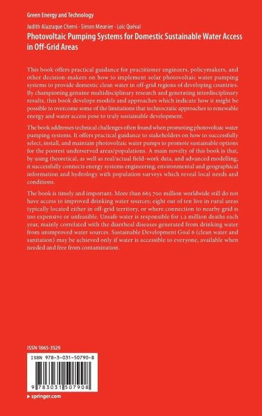 The book is timely and important. More than 665 700 million worldwide still do not have access to improved drinking water sources; eight out of ten live in rural areas typically located either in off-grid territory, or where connection to nearby grid is too expensive or unfeasible. Unsafe water is responsible for 1.2 million deaths each year, mainly correlated with the diarrheal diseases generated from drinking water from unimproved water sources. Sustainable Development Goal 6 (clean water and sanitation) may be achieved only if water is accessible to everyone, available when needed and free from contamination.
