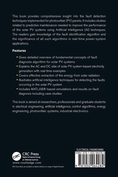 This book provides comprehensive insight into the fault detection techniques implemented for photovoltaic (PV) panels. It includes studies related to predictive maintenance needed to improve the performance of the solar PV systems using Artificial Intelligence (AI) techniques. The readers gain knowledge on the fault identification algorithm and the significance of all such algorithms in real-time power system applications.