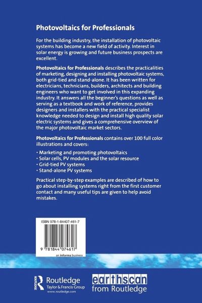 For the building industry, the installation of photovoltaic systems has become a new field of activity. Interest in solar energy is growing and future business prospects are excellent. Photovoltaics for Professionals describes the practicalities of marketing, designing and installing photovoltaic systems, both grid-tied and stand-alone. It has been written for electricians, technicians, builders, architects and building engineers who want to get involved in this expanding industry. It answers all the beginner's questions as well as serving as a textbook and work of reference, provides designers and installers with practical specialist knowledge needed to design and install high quality solar electric systems and gives a comprehensive overview of the major photovoltaic market sectors. Photovoltaics for Professionals contains over 100 full colour illustrations and covers: Marketing and promoting photovoltaics Solar cells, PV modules and the solar resource Grid-tied PV systems Stand-alone PV systems Practical step-by-step examples are described of how to go about installing systems right from the first customer contact and many useful tips are given to help avoid mistakes.
