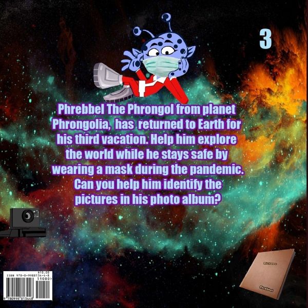 The 3rd book of the series, Phrebbel The Phrongol from planet Phrongolia, has taken many pictures while vacationing on planet Earth again. Help him explore the world while he stays safe by wearing a mask during the pandemic.This is a full color picture book designed to inspire critical thinking in CHILDREN. The pictures are of everyday things like people and animals you would see in nature and on planet Earth in general. The pictures allow the reader to come up with answers to help the main character Phrebbel, identify things he has never seen on planet Earth before. A brain teaser for kids that makes learning fun!