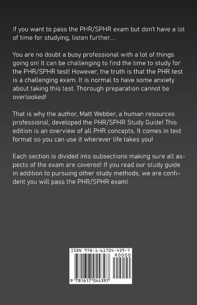 If you want to pass the PHR/SPHR exam but don't have a lot of time for studying, listen further.... You are no doubt a busy professional with a lot of things going on! It can be challenging to find the time to study for the PHR/SPHR test! However, the truth is that the PHR test is a challenging exam. It is normal to have some anxiety about taking this test. Thorough preparation cannot be overlooked! That is why the author, Matt Webber, a human resources professional, developed the PHR/SPHR Study Guide! This edition is an overview of all PHR concepts. It comes in text format so you can use it wherever life takes you! Each section is divided into subsections making sure all aspects of the exam are covered! If you read our study guide in addition to pursuing other study methods, we are confident you will pass the PHR/SPHR exam!