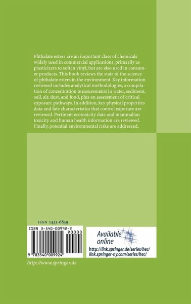 Phthalate esters are an important class of chemicals widely used in commercial applications, primarily as plasticizers to soften vinyl, but they are also used in consumer products. This book reviews the state of the scientific knowledge of phthalate esters in the environment. Key information reported includes: analytical methodologies; a compilation of concentration measurements in water, sediment, soil, air, dust, and food; plus an assessment of critical exposure pathways. In addition, key physical properties data and fate characteristics that control exposure are reviewed. Also included are pertinent ecotoxicity data and mammalian toxicity and human health information. Finally, the monograph addresses potential environmental risks.