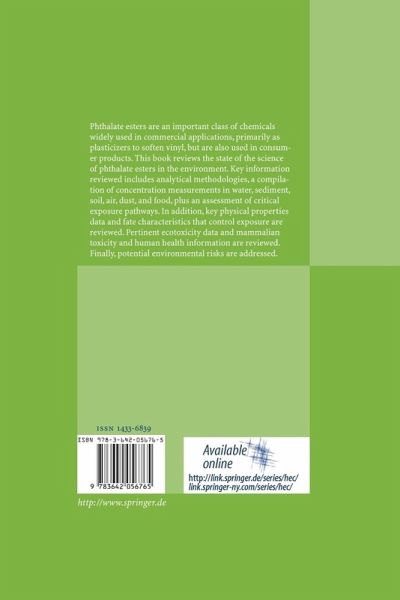 Phthalate esters are an important class of chemicals widely used in commercial applications, primarily as plasticizers to soften vinyl, but they are also used in consumer products. This book reviews the state of the scientific knowledge of phthalate esters in the environment. Key information reported includes: analytical methodologies; a compilation of concentration measurements in water, sediment, soil, air, dust, and food; plus an assessment of critical exposure pathways. In addition, key physical properties data and fate characteristics that control exposure are reviewed. Also included are pertinent ecotoxicity data and mammalian toxicity and human health information. Finally, the monograph addresses potential environmental risks.