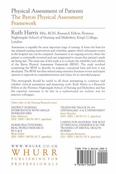Assessment is arguably the most important stage of nursing. It forms the basis for any planned nursing intervention and a baseline against which subsequent events in the hospital stay can be compared. Assessment is an ongoing activity where the patient is continually reviewed and care reappraised to ensure that the patient's needs are being met. The amin aim of this study is to evaluate the reliability and validity of the Byron Physical Assessment Framework (BPAF). the study involved scrutinisin the BPAF to describe its purpose, conceptual basis and how it waas developed. The BAF was then refined using extensive literature review and expert opinion to improve its comprehensiveness and clarity for its intended purpose. This monograph should be useful to all those attempting to construct and validate clinical assessment and measuring tools. Ruth Harris has the expertise necessary to do this in a sophisticated yet realistic way for practice colleagues.