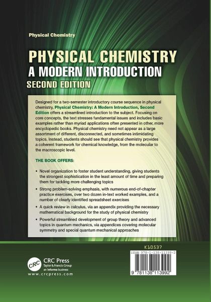 Designed for a two-semester introductory course sequence in physical chemistry, Physical Chemistry: A Modern Introduction, Second Edition offers a streamlined introduction to the subject. Focusing on core concepts, the text stresses fundamental issues and includes basic examples rather than the myriad of applications often presented in other, more encyclopedic books. Physical chemistry need not appear as a large assortment of different, disconnected, and sometimes intimidating topics. Instead, students should see that physical chemistry provides a coherent framework for chemical knowledge, from the molecular to the macroscopic level. The book offers: Novel organization to foster student understanding, giving students the strongest sophistication in the least amount of time and preparing them to tackle more challenging topics Strong problem-solving emphasis, with numerous end-of-chapter practice exercises, over two dozen in-text worked examples, and a number of clearly identified spreadsheet exercises A quick review in calculus, via an appendix providing the necessary mathematical background for the study of physical chemistry Powerful streamlined development of group theory and advanced topics in quantum mechanics, via appendices covering molecular symmetry and special quantum mechanical approaches