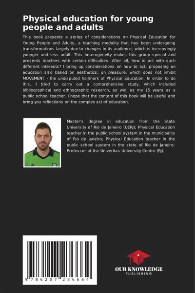 This book presents a series of considerations on Physical Education for Young People and Adults, a teaching modality that has been undergoing transformations largely due to changes in its audience, which is increasingly younger and less adult. This heterogeneity makes this group special and presents teachers with certain difficulties. After all, how to act with such different interests? I bring up considerations on how to act, proposing an education also based on aesthetics, on pleasure, which does not inhibit MOVEMENT - the undisputed hallmark of Physical Education. In order to do this, I tried to carry out a comprehensive study, which included bibliographical and ethnographic research, as well as my 15 years as a public school teacher. I hope that the content of this book will be useful and bring you reflections on the complex act of education.