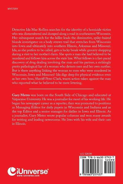 Detective Ida Mae Rollins searches for the identity of a homicide victim who was dismembered and dumped along a road in southeastern Wisconsin. Her subsequent search for the killer leads the diminutive, spiky-haired blonde investigator on a body strewn trail that stretches from Wisconsin into Iowa and ultimately into southern Illinois, Arkansas and Missouri. Ida, as she prefers to be called, gets a lucky break while grocery shopping during a visit to her mother's farm. She spots a man she had believed to be murdered and follows him across the state line. What follows is a fast-paced discovery of drug dealing involving the man and his partner, a strikingly pretty pathological liar of a woman who detests men and her own mother. But is there anything linking the woman to men who were murdered in Wisconsin, Iowa and Missouri? Ida digs deep for physical evidence even as her own boss, Sheriff Peter Clark, wants action taken against the man who reported what he believed to be mere littering.