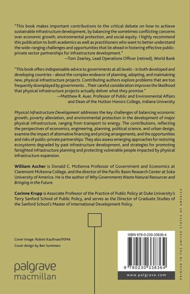 "Among other audiences, this book offers indispensable advice to governments at all levels - in both developed and developing countries - about the complex endeavor of planning, adopting, and maintaining new, physical infrastructure projects. Contributing authors explore problems that are too frequently downplayed by governments. Equity implications of different infrastructure financing schemes, the reconciliation of public and private investors' notions of risk, and infrastructure's varying impacts on poor peoples' livelihoods and health - among many other considerations - must be embedded into the decision calculus. These weighty concerns do not necessarily preclude infrastructure investments, the authors carefully explain. Rather, their careful consideration improves the likelihood that physical infrastructure projects actually deliver what they promise." - Matthew R. Auer, Professor of Public and Environmental Affairs and Dean of the Hutton Honors College, Indiana University