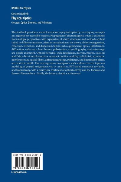 This textbook provides a sound foundation in physical optics by covering key concepts in a rigorous but accessible manner. Propagation of electromagnetic waves is examined from multiple perspectives, with explanation of which viewpoints and methods are best suited to different situations. After an introduction to the theory of electromagnetism, reflection, refraction, and dispersion, topics such as geometrical optics, interference, diffraction, coherence, laser beams, polarization, crystallography, and anisotropy are closely examined. Optical elements, including lenses, mirrors, prisms, classical and Fabry-Perot interferometers, resonant cavities, multilayer dielectric structures, interference and spatial filters, diffraction gratings, polarizers, and birefringent plates, are treated in depth. The coverage also encompasses such seldom-covered topics as modeling of general astigmatism via 4x4 matrices, FFT-based numerical methods, and bianisotropy, with a relativistic treatment of optical activity and the Faraday and Fresnel-Fizeau effects. Finally, the history of optics is discussed.