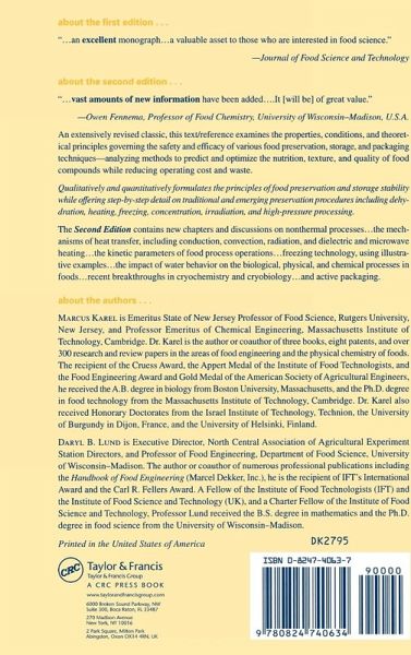 Marcus Karel is Emeritus State of New Jersey Professor of Food Science, Rutgers University, New Jersey, and Professor Emeritus of Chemical Engineering, Massachusetts Institute of Technology, Cambridge. Dr. Karel is the author or coauthor of three books, eight patents, and over 300 research and review papers in the areas of food engineering and the physical chemistry of foods. The recipient of the Cruess Award, the Appert Medal of the Institute of Food Technologists, and the Food Engineering Award and Gold Medal of the American Society of Agricultural Engineers, he received the A.B. degree in biology from Boston University, Massachusetts, and the Ph.D. degree in food technology from the Massachusetts Institute of Technology, Cambridge. Dr. Karel also received Honorary Doctorates from the Israel Institute of Technology, Technion, the University of Burgundy in Dijon, France, and the University of Helsinki, Finland. Daryl B. Lund is Executive Director, North Central Association of Agricultural Experiment Station Directors, and Professor of Food Engineering, Department of Food Science, University of Wisconsin-Madison. The author or coauthor of numerous professional publications including the Handbook of Food Engineering (Marcel Dekker, Inc.), he is the recipient ofIFT's International Award and the Carl R. Fellers Award. A Fellow of the Institute of Food Technologists (IFT) and the Institute of Food Science and Technology (UK), and a Charter Fellow of the Institute of Food Science and Technology, Professor Lund received the B.S. degree in mathematics and the Ph.D. degree in food science from the University of Wisconsin-Madison.